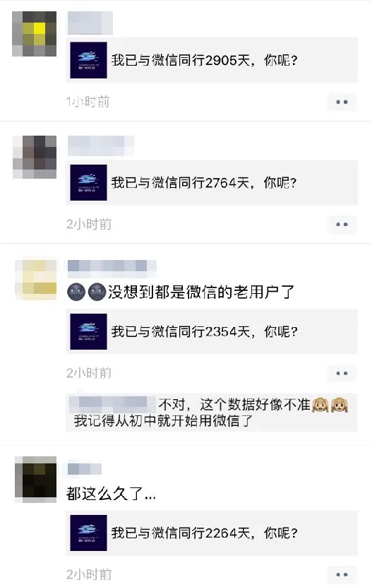 因为微信诞生也才 2910 天,所以那些数字比较大的朋友们,果不其然在朋友圈里炫耀起了自己的“同行时间”。