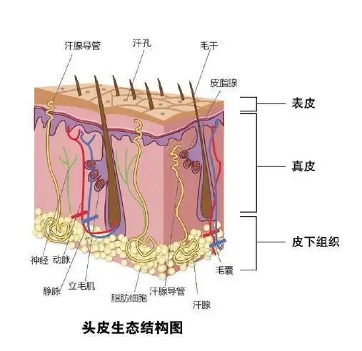 我在之前的文章里就说过,所有头发问题的根源都在头皮问题。头皮也是皮肤,和皮肤结构类似,头皮也有角质层、表皮层和真皮层等结构,而产生头发的毛囊就位于真皮层中,头皮不健康会直接影响头发生长和质量,从头皮出油、头皮屑开始,并造成脱发、断发等一系列问题。