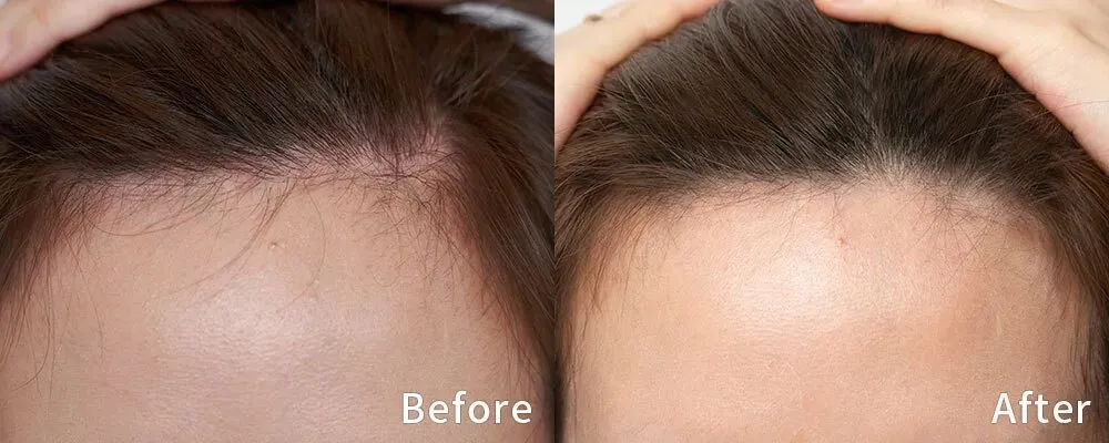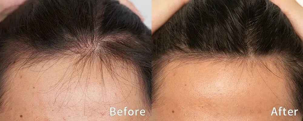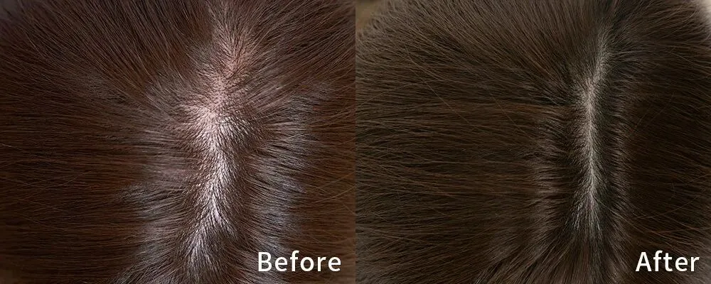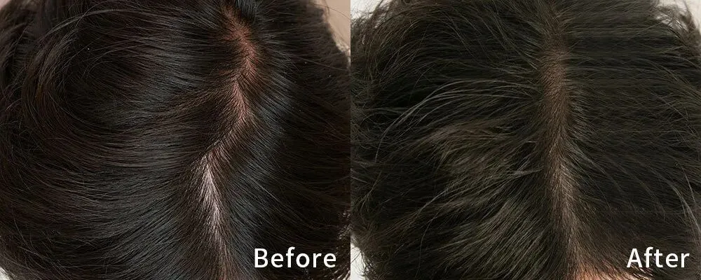 对比图非常明显,头发从之前的油腻、软塌到21天之后的丰盈蓬松,发质的改善有目共睹。注意看发缝和头皮变化,头皮颜色从原先的粉红到健康色的青白,头发密度也在增加。