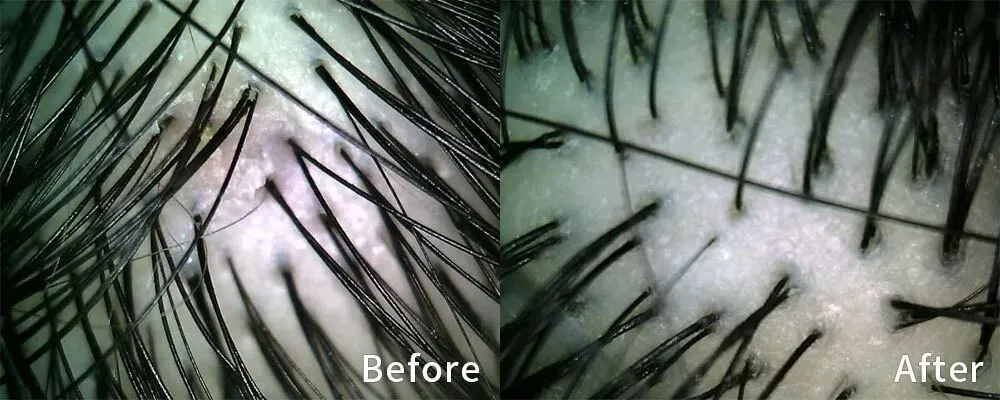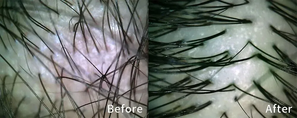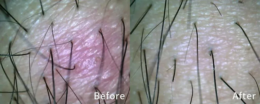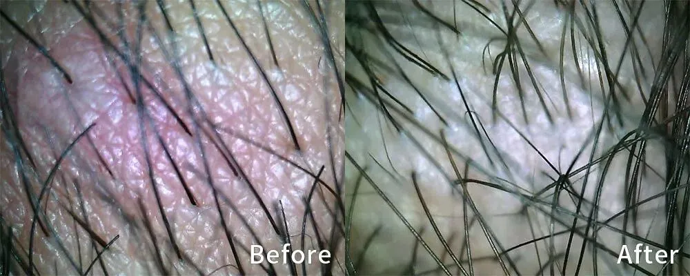头发整体健康程度提升24%,注意看右边头皮的对比,从原先的红肿敏感,到21天之后的健康水润。头皮的变化也体现在毛囊状态及头发密度上,现在每个毛囊的发丝数量在增加,证明新头发长出来了。