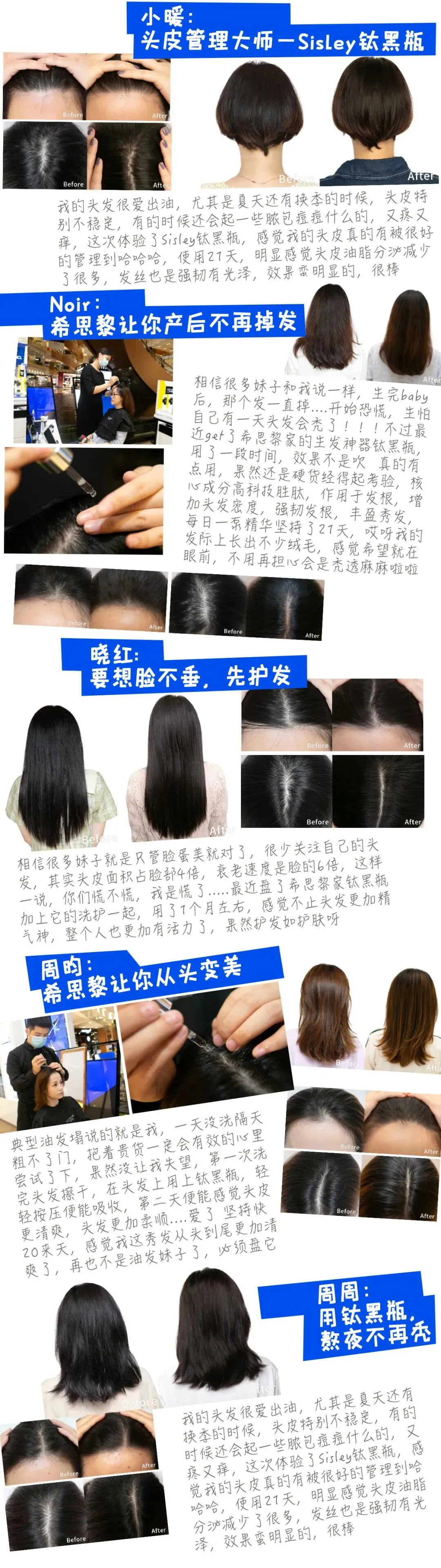 “我虽然发量多,但掉发也多,特别换季的时候一掉一大把。这次使用希思黎钛黑瓶+净化基底发膜21天之后,每次梳头和洗头,能明显感觉掉发在变少,终于不是一把把地掉了。另外,头发摸上去也滑了许多,终于不是之前那种晦涩干枯的杂草状态。”