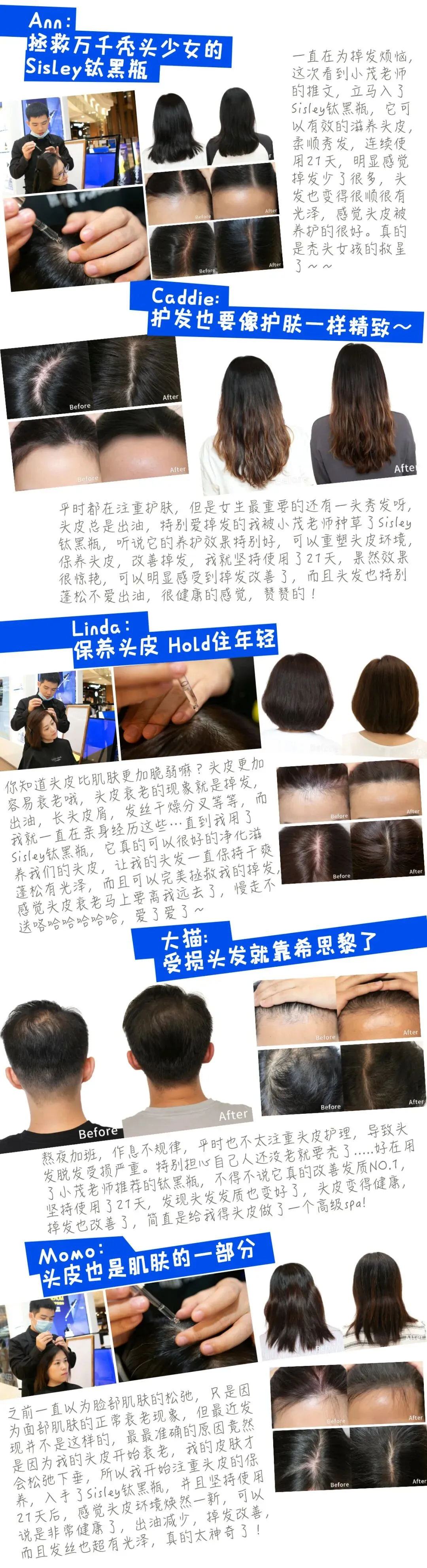 “我非常非常喜欢希思黎钛黑瓶,每次只需一丢丢,非常清爽好吸收,但用完效果完全不一样,秒杀任何护发精油。就像小茂老师说的,这更像是一瓶给头皮用的“肌底精华“,能改善整个头皮环境并且非常厉害能做到头皮抗衰,差不多用到第二周第三周,你会觉得头皮在变紧,脸皮也在紧致,真的超级厉害。