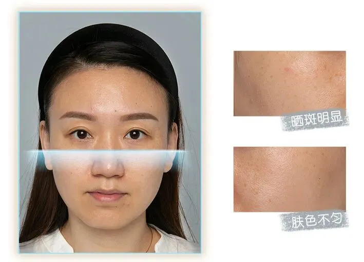 从某种程度上,这是最抓人眼球的一个功能,因为没什么比立刻、马上、一下子看到脸上的色斑消失来得更激动人心,但OPTE就是能做到。感觉就是机器在脸上那么轻轻一扫,斑点瞬间消失,使用过程等于直接在真人脸上来了一次现场版的“Photoshop级修图”,妥妥的靓女下“斑”!
