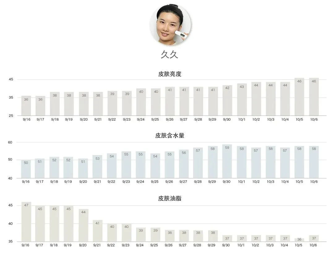 数据上也是漂漂亮亮,由于面部整体的黑色素减少,体现皮肤亮度的数据大幅上升,视觉上就是角质层透亮,肤色均匀,面部可见的皮肤瑕疵减少。同时,皮肤水油趋于平衡健康,肤质整体得到提升。