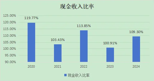 现金收入比例基本都稳定在100%以上,代表着每一分营收都有一分现金保障。
