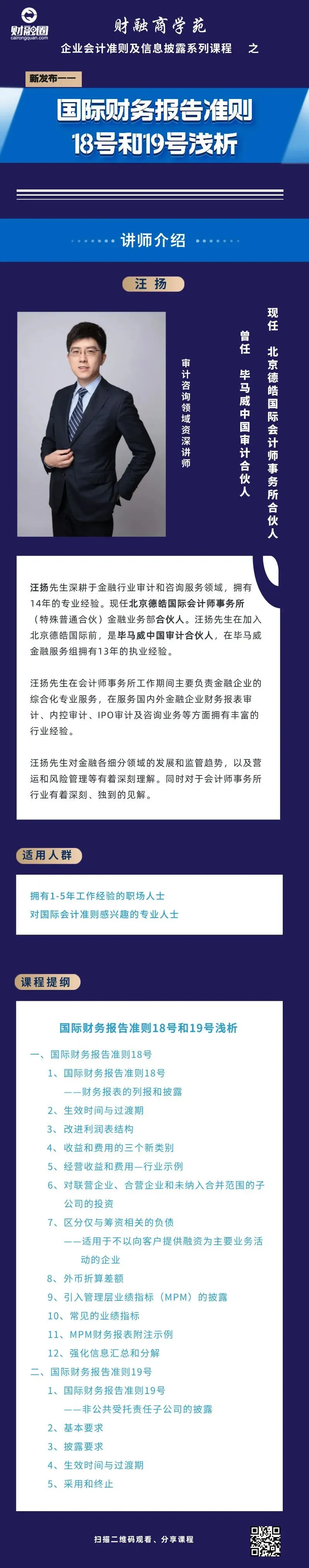 本课程为财融圈专为粉丝打造的“企业会计准则及信息披露系列课程”之一,课程主要讲述新发布的国际报告准则18号及19号核心知识点及解析。本课程由从事金融行业审计多年的前毕马威中国审计合伙人讲授。(注:扫描图片底部二维码即可加入我们)