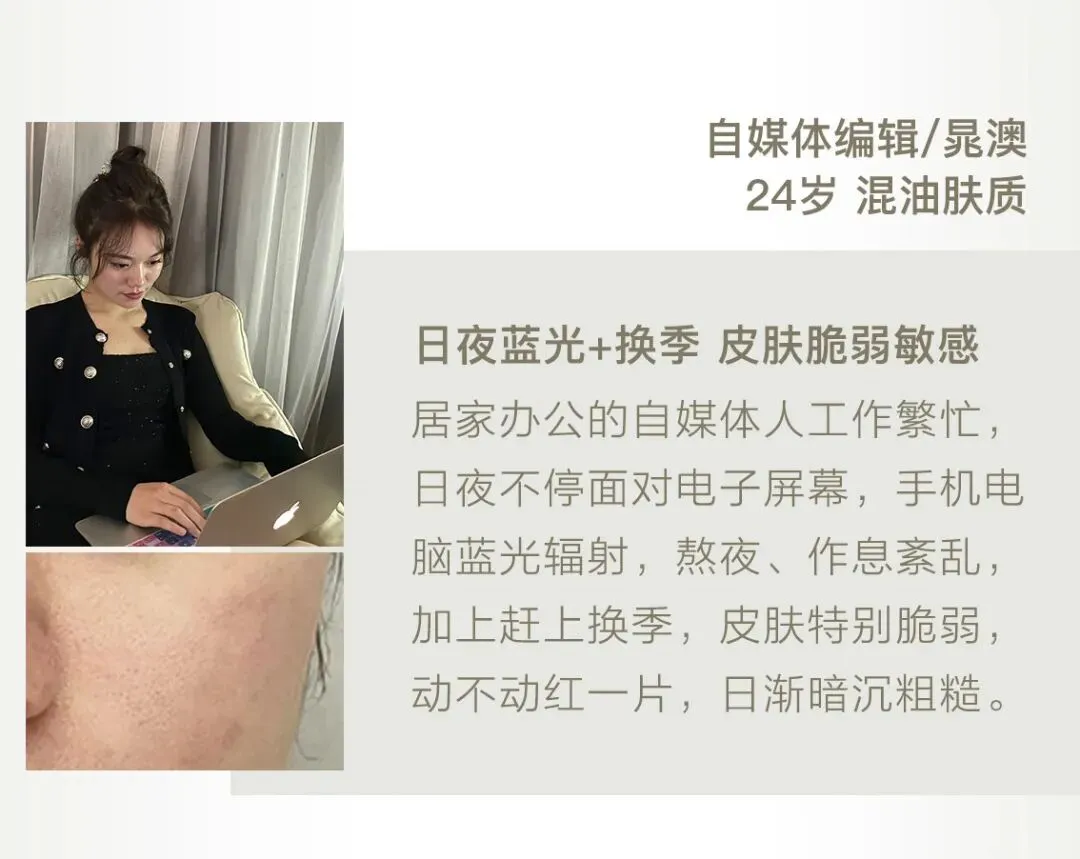 这次的5位测试者,都是处于封控居家或者特殊情况的粉丝,由于生活被打破常规,心理压力大、情绪焦虑、作息颠倒等多重因素影响,造成皮肤敏感损伤、老化加快。