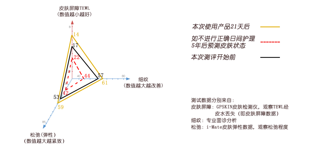 并且,根据皮肤一般发展规律,如果她们持续现在的生活、护肤方式,不尽早干涉,重视起日间保养,按现有趋势可以预见5年之后,皮肤老化问题会呈现更严重的状态,各项数据都会大幅变差。
