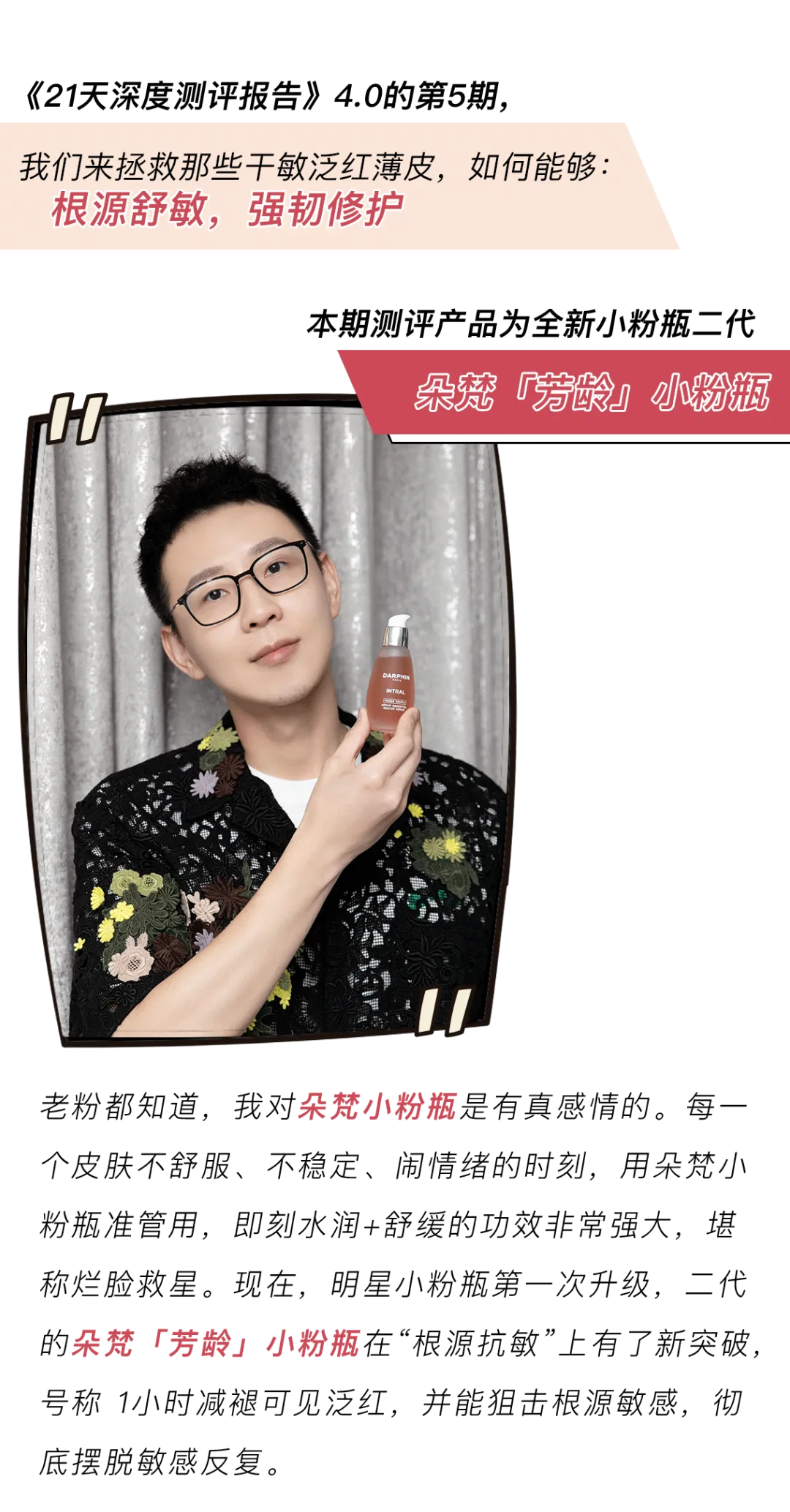 全新朵梵「芳龄」小粉瓶适合所有肌肤类型,尤其有干、敏、薄问题的肤质。本期6位测试者21天早晚使用产品,表示二代小粉瓶真的很好用。