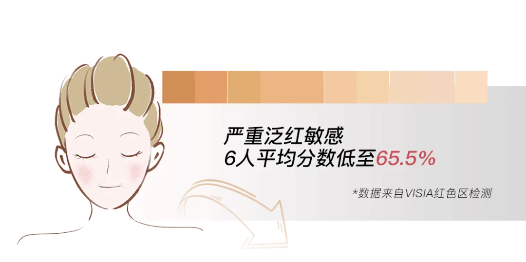 VISIA红色区的数值可以体现皮下的毛细血管充盈程度,能较好地反映面部整体泛红程度,其中数值越低代表泛红、红血丝等红色瑕疵越明显。此次6人的红色区指数平均低至65.5%,属于泛红敏感的皮肤。如果不及时加以干预,这个分数还会越来越低。