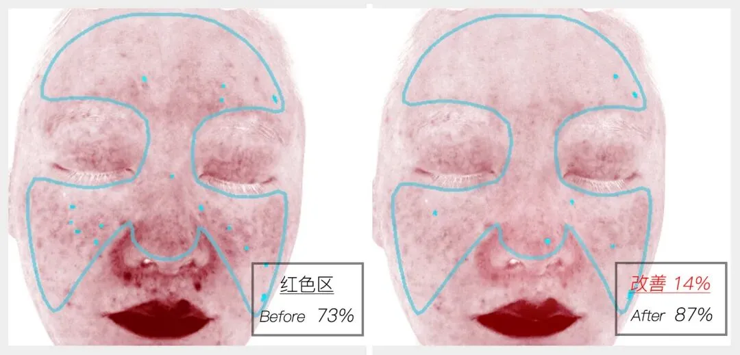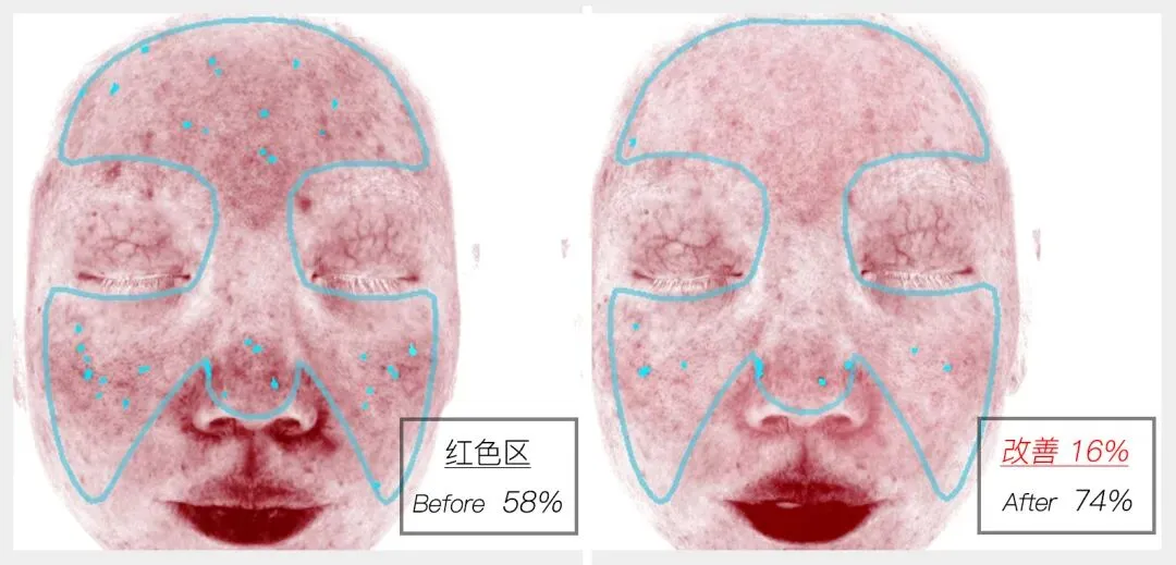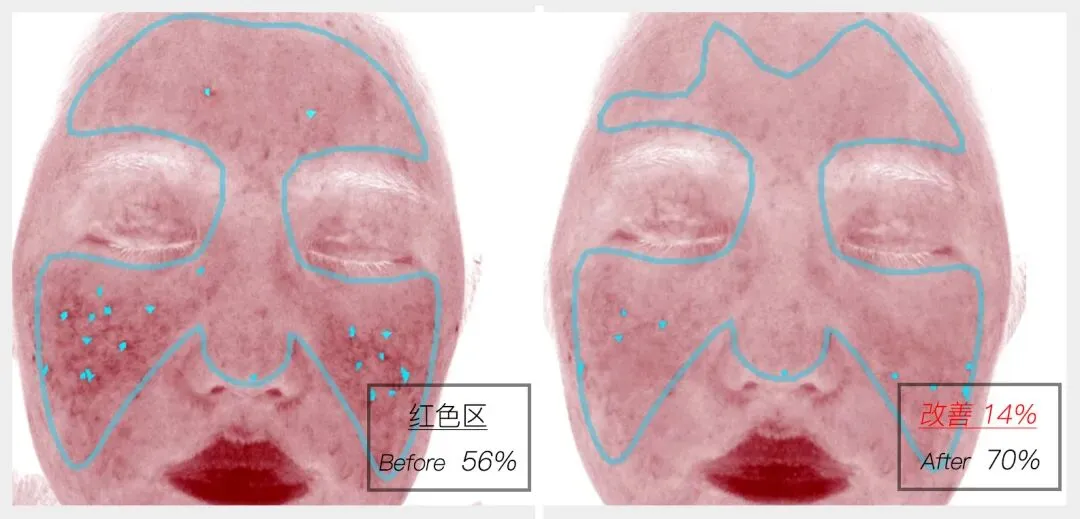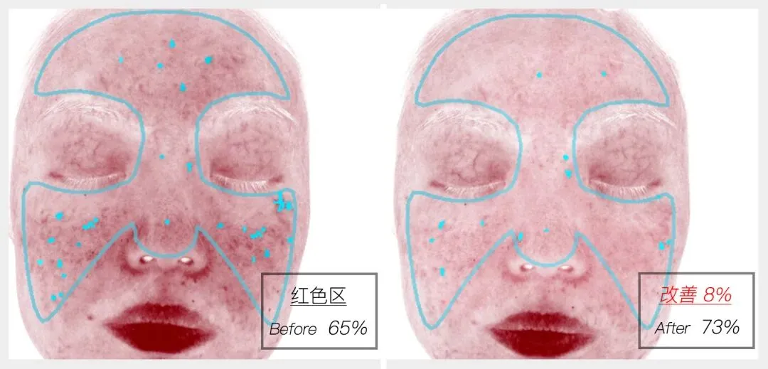 VISIA红色区改善14%,尤其两颊红血丝问题得到了有效控制。
