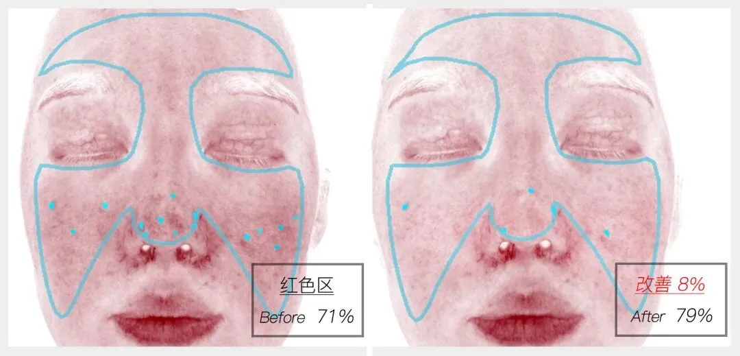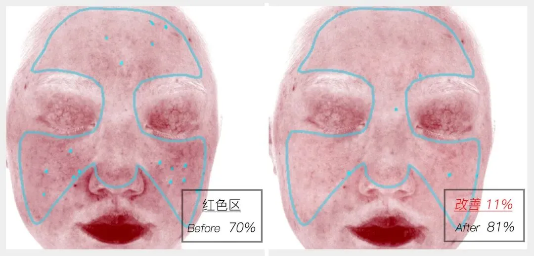 VISIA红色区改善11%,尤其两颊区域的大面积泛红得到了改善。