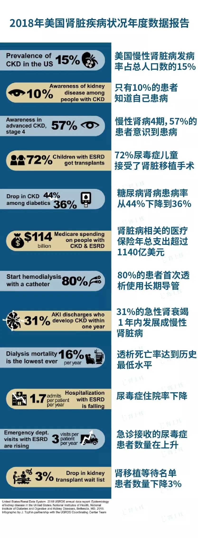 不久之前,美国肾脏数据系统USRDS,公布了2018年美国肾脏病年度数据报告,下图涵盖了它最新的关键数据和趋势: