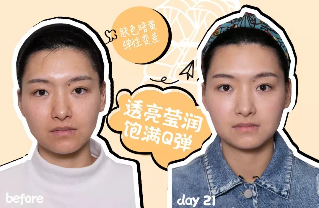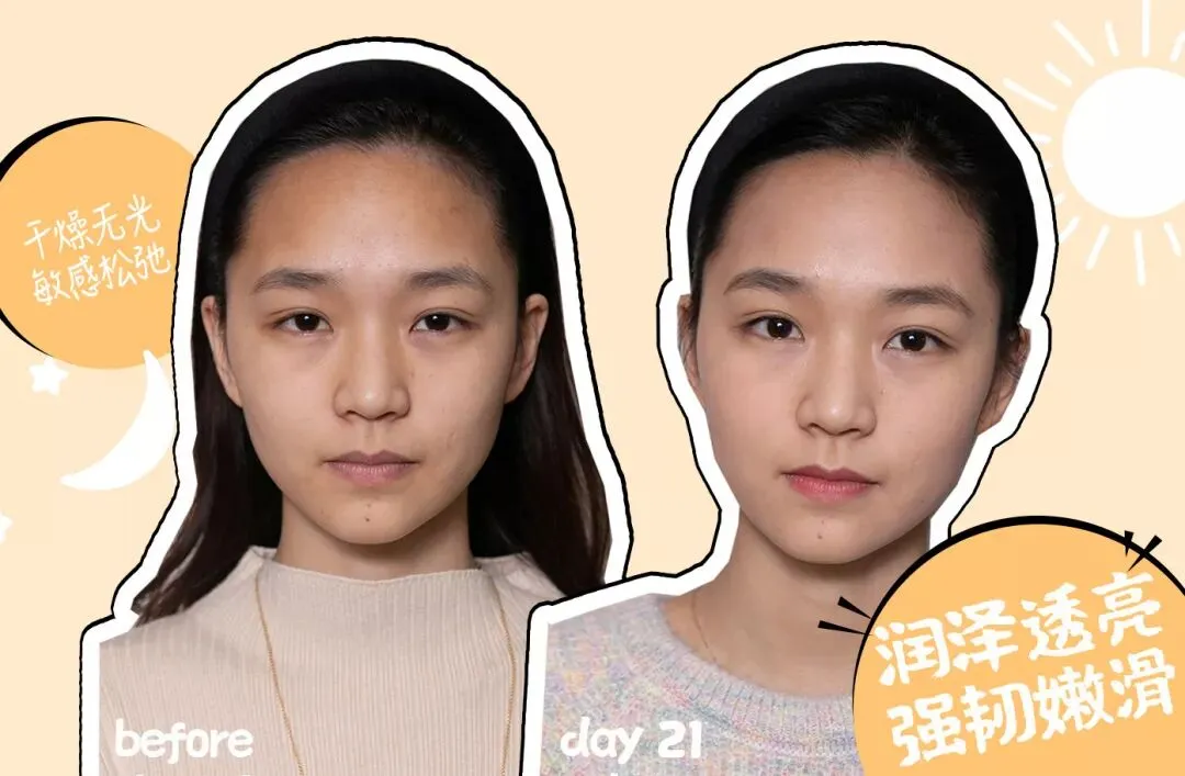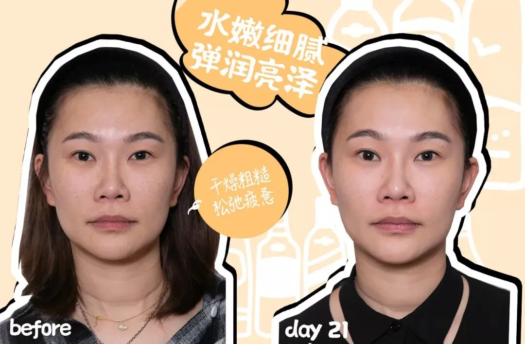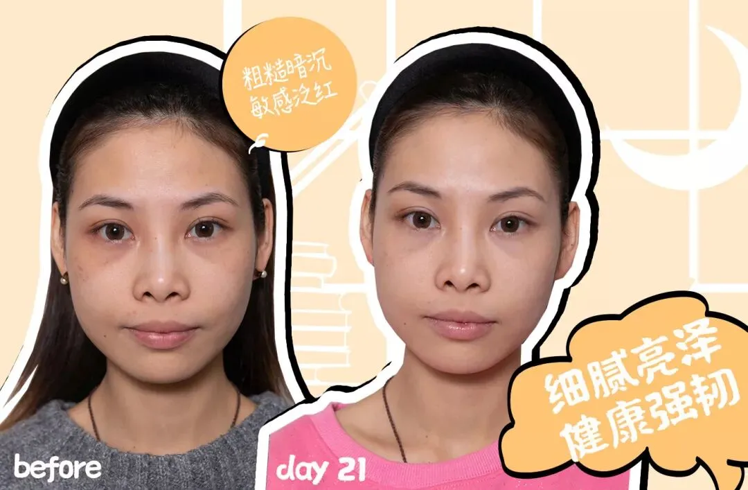 21天以后,皮肤干燥得到缓解,肤色提亮、皮肤回弹性变好,更加紧致弹润。甚至到最后,因为年轻的关系,用OLAY酵母水配合熬夜霜,让整个皮肤“通”了以后,刘梦娇的脸越熬越亮!(这里并没有鼓励熬夜的意思)
