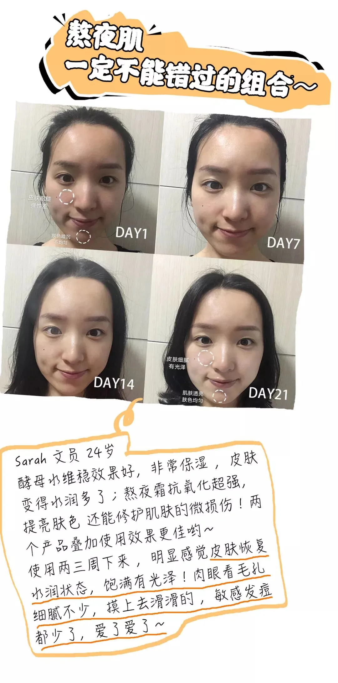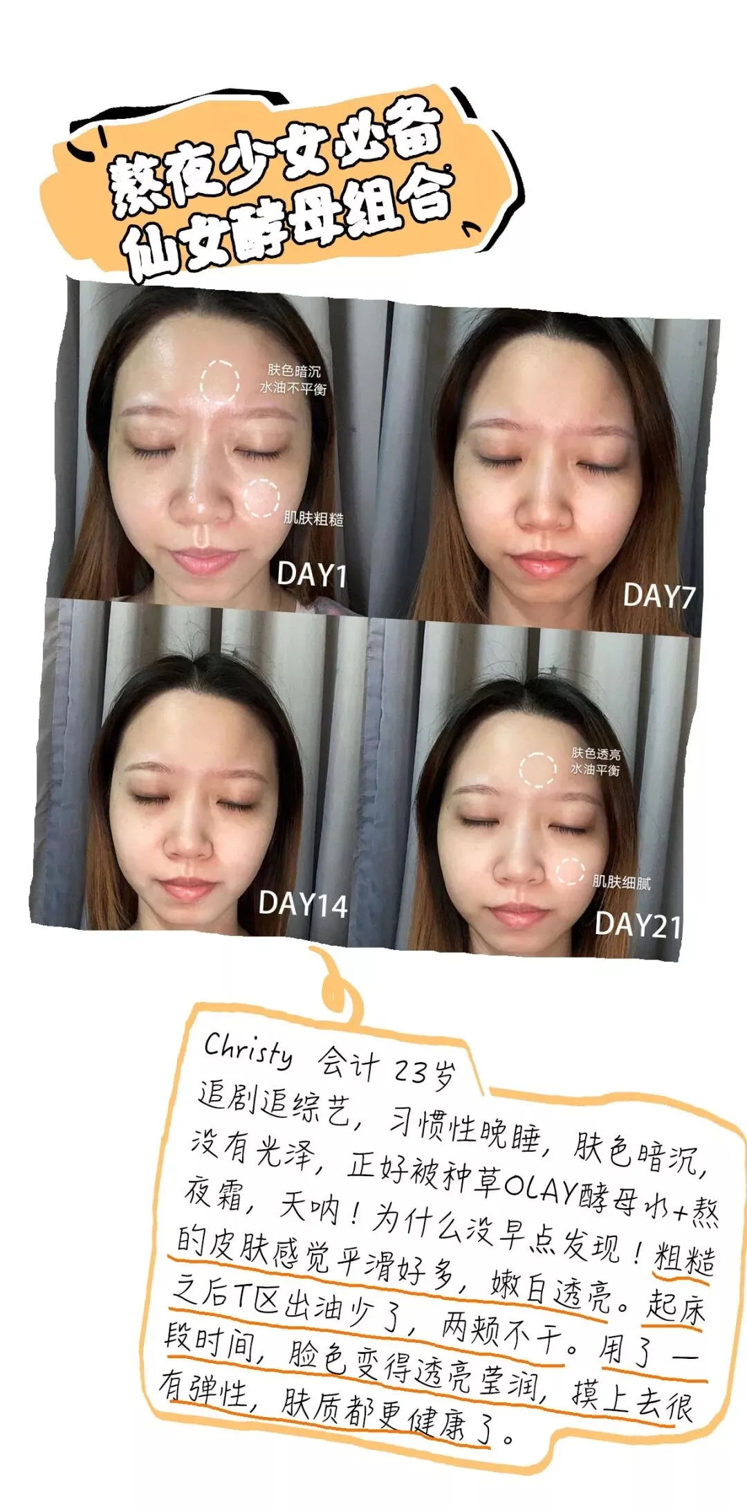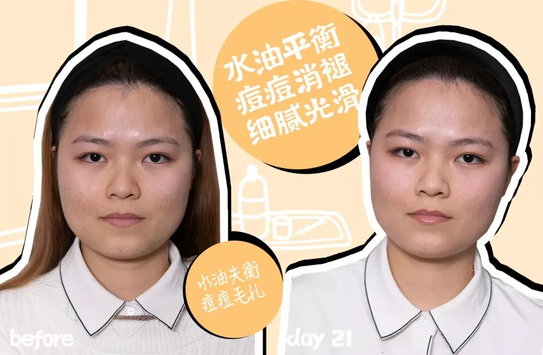 21天以后,皮肤干燥得到缓解,肤色提亮、皮肤回弹性变好,更加紧致弹润。甚至到最后,因为年轻的关系,用OLAY酵母水配合熬夜霜,让整个皮肤“通”了以后,刘梦娇的脸越熬越亮!(这里并没有鼓励熬夜的意思)