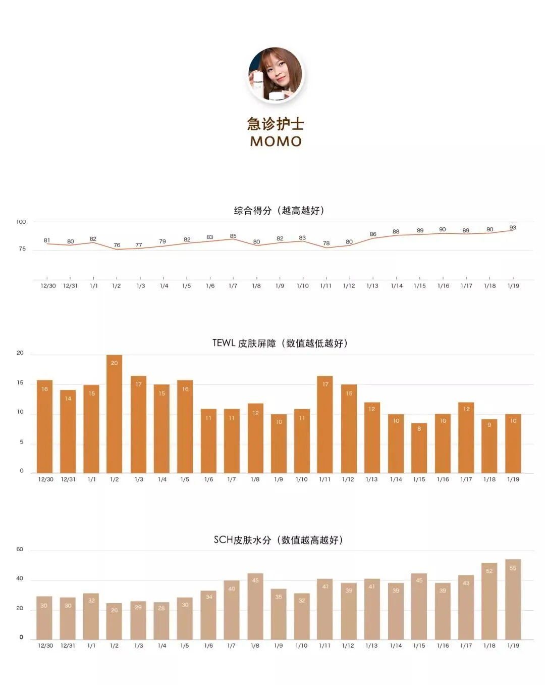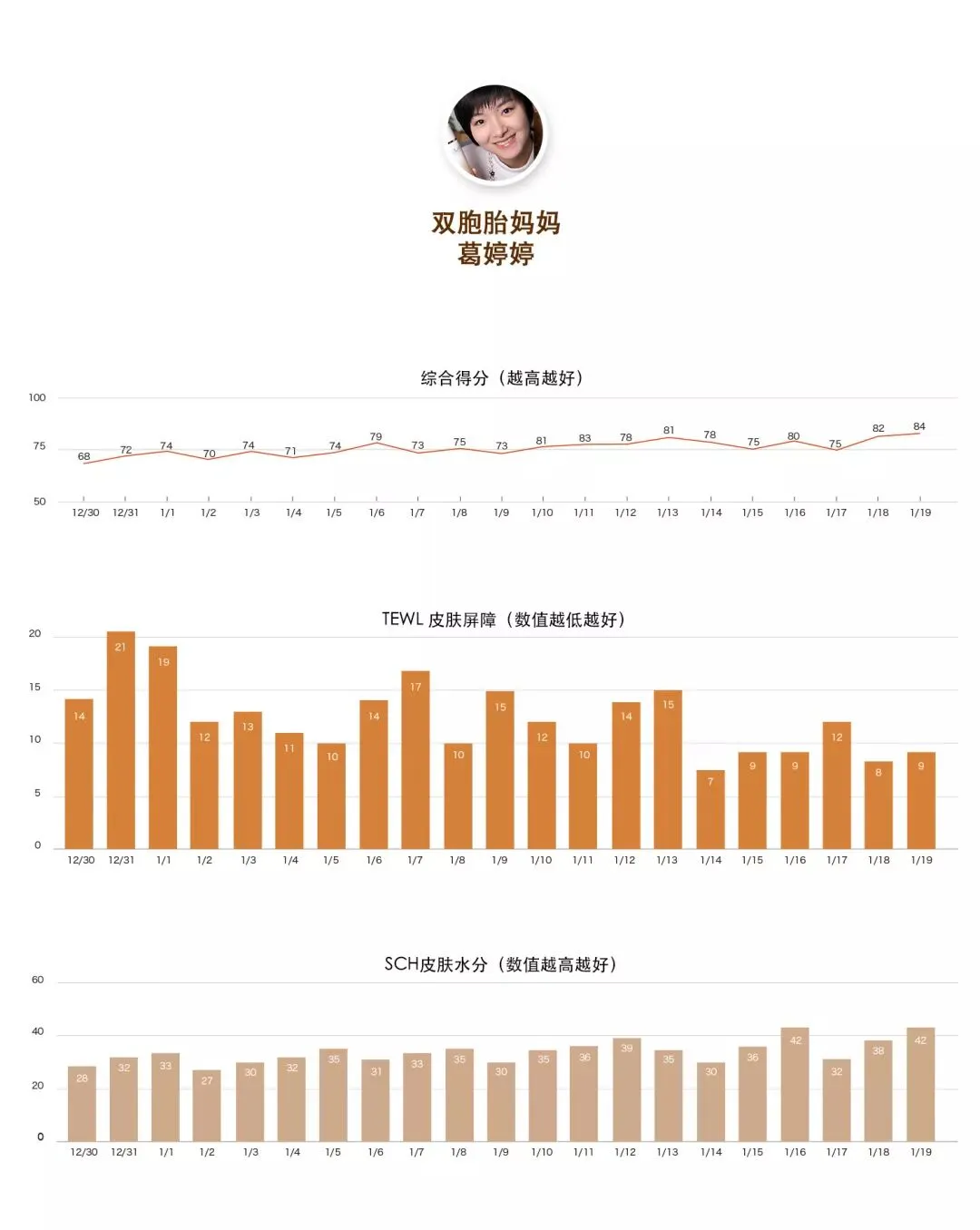 双胞胎妈妈的数据一直在平稳改善中,除去17日由于连日操劳引发发烧,数据有所下降以外,其余日子反映皮肤健康指标的两项数据都在改善,水润度提高许多,皮肤敏感也变少了。