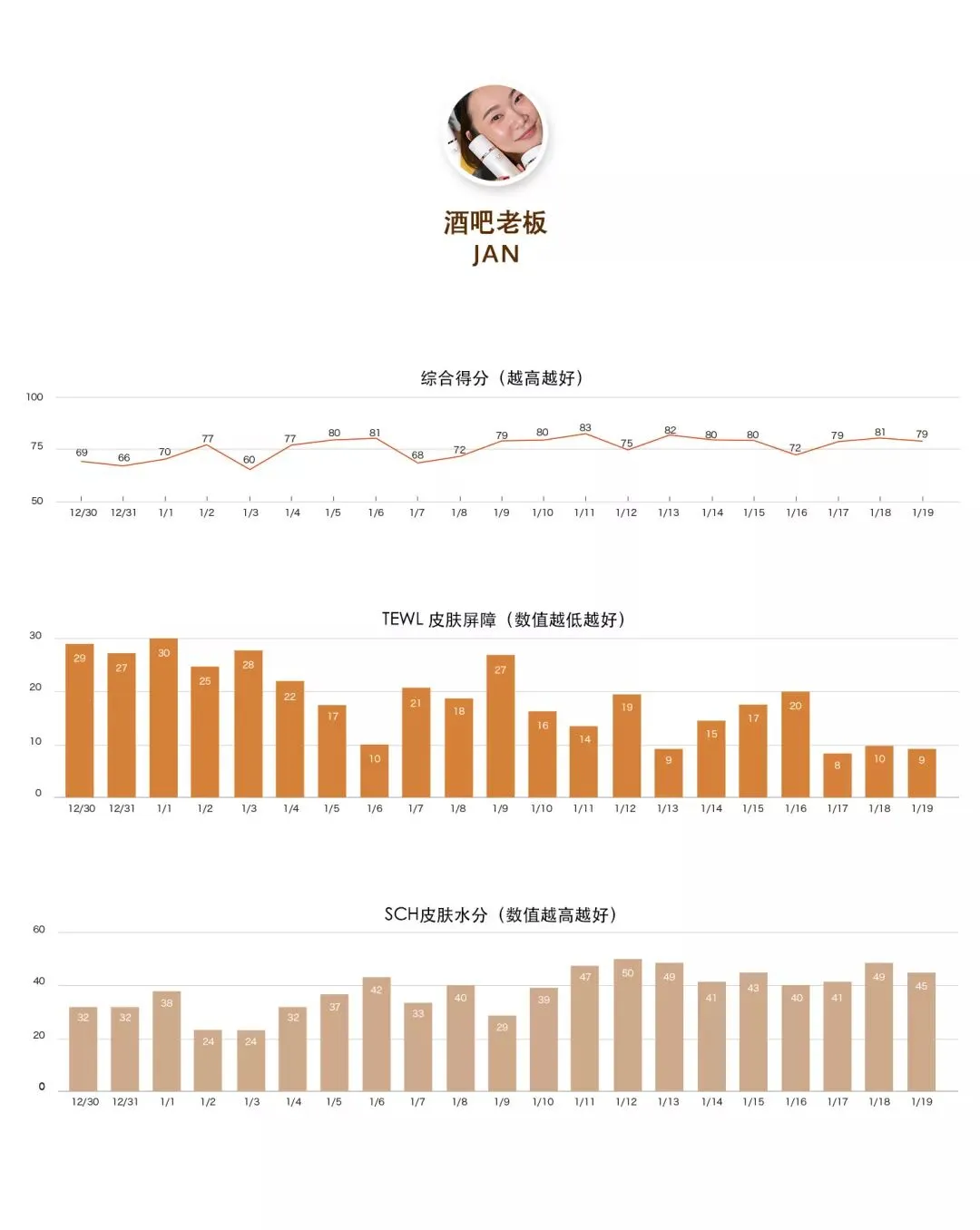 在差不多从7号开始的一周里,苗苗连续一周的睡眠时间不足5小时,日常靠咖啡续命,因此那段时间里皮肤经皮失水率出现了2次比较大的反弹;但数据要联系在一起看,表格中能很清晰地看出皮肤的含水量一直在稳健提升,这说明在使用OLAY熬夜家族的期间里,皮肤角质层是在一个持续健康转好的状态中,皮肤水油平衡,因此综合得分也越来越好。