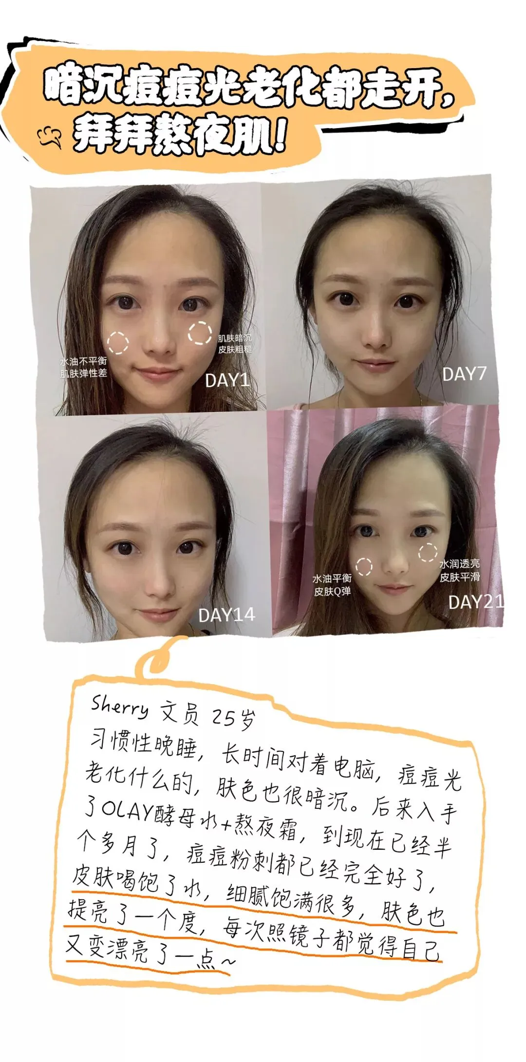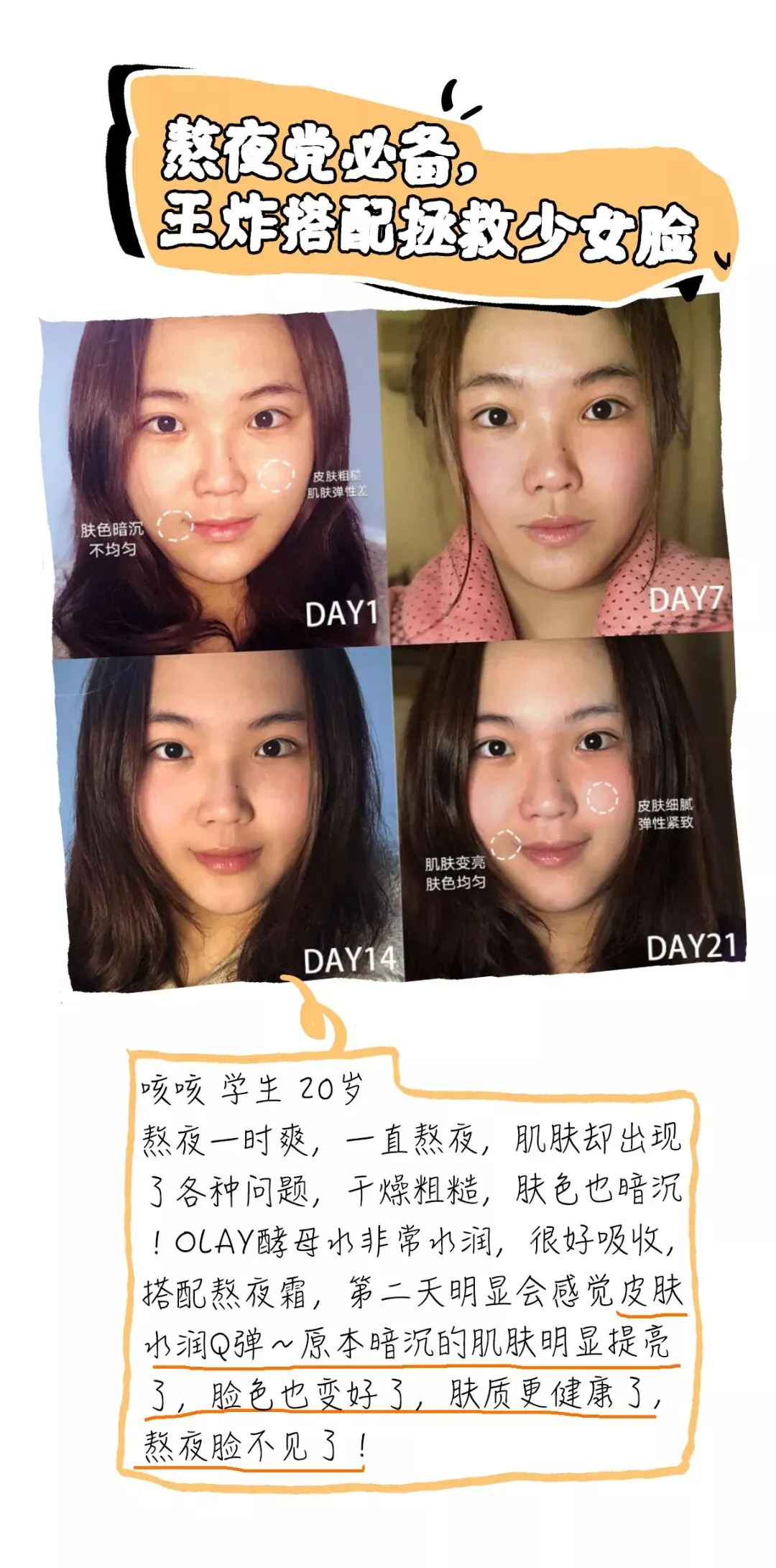 “我没太多时间花在护肤上(多睡一分钟都是好的),但使用了OLAY酵母水+熬夜霜之后,同事们都说我皮肤变好太多,上班后就没停过的压力痘开始成片往下褪了,肤色比之前好太多,也终于不再是油脑门了!