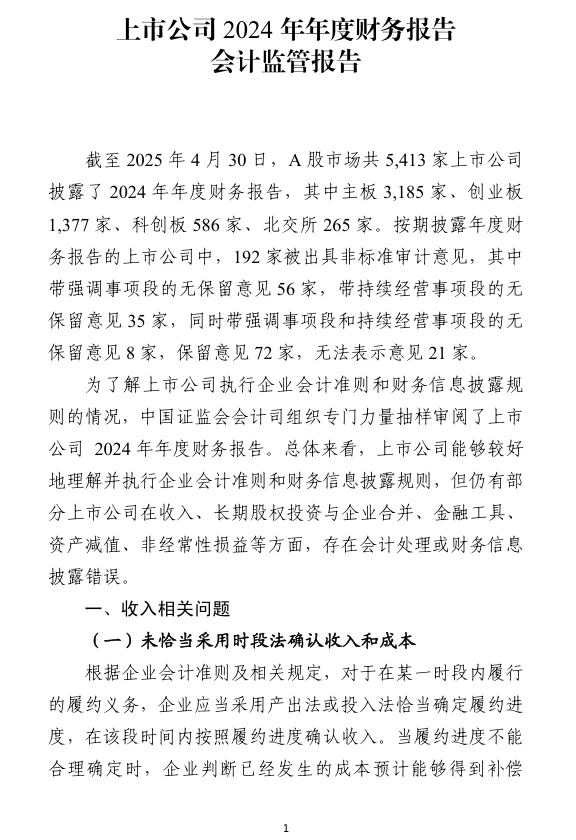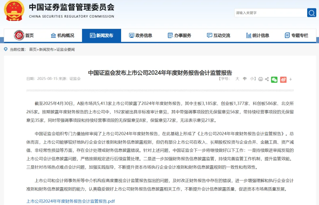 中国证监会发布上市公司2024年年度财务报告会计监管报告