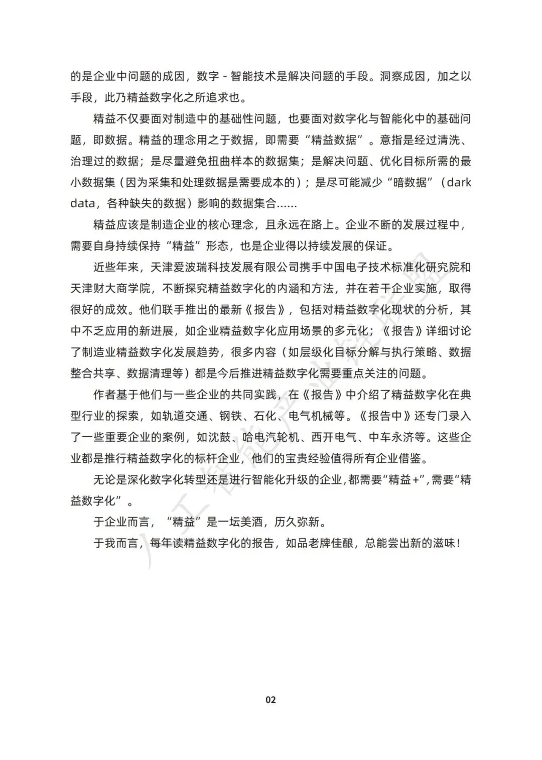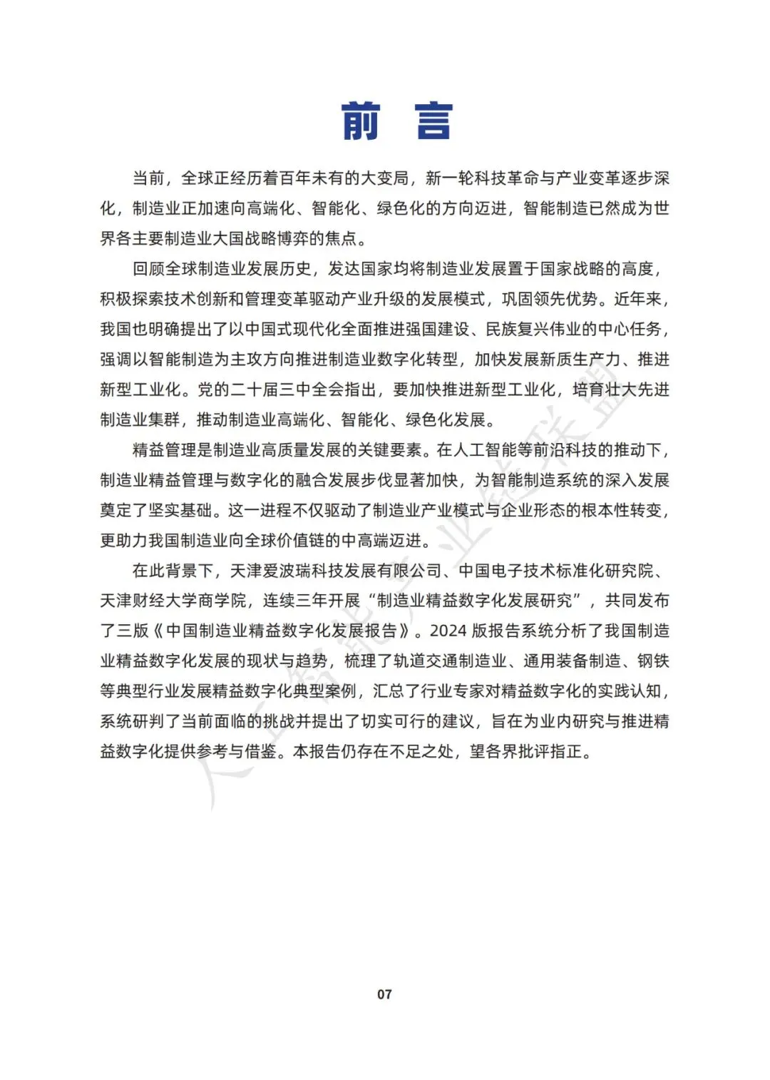 精益管理是制造业高质量发展的关键要素。在人工智能等前沿科技的推动下, 制造业精益管理与数字化的融合发展步伐显著加快,为智能制造系统的深入发展 奠定了坚实基础。这一进程不仅驱动了制造业产业模式与企业形态的根本性转变, 更助力我国制造业向全球价值链的中高端迈进。 在此背景下,天津爱波瑞科技发展有限公司、中国电子技术标准化研究院、 天津财经大学商学院,连续三年开展“制造业精益数字化发展研究”,共同发布 了三版《中国制造业精益数字化发展报告》。
