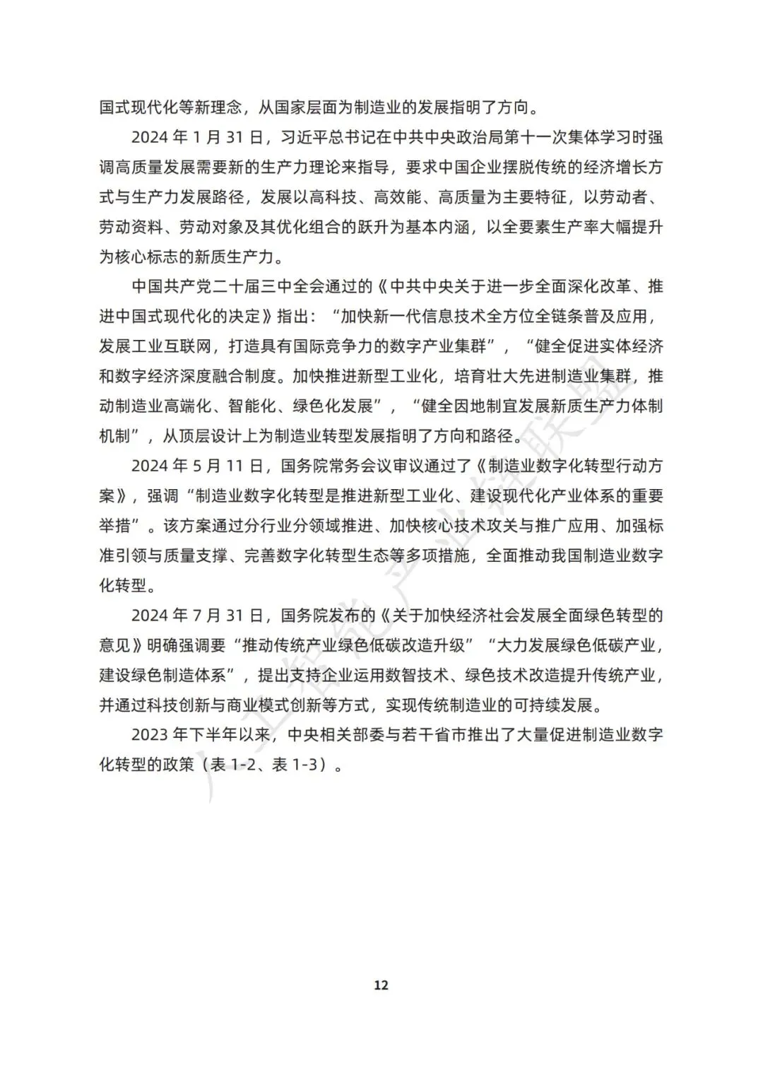 2024 年 7 月 31 日,国务院发布的《关于加快经济社会发展全面绿色转型的 意见》明确强调要“推动传统产业绿色低碳改造升级”“大力发展绿色低碳产业, 建设绿色制造体系”,提出支持企业运用数智技术、绿色技术改造提升传统产业, 并通过科技创新与商业模式创新等方式,实现传统制造业的可持续发展。