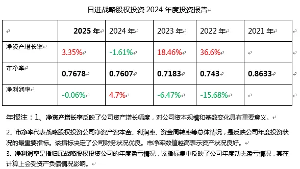 截止2024年12月31日,日进投资净资产增长幅度为3.35%,相比2024年有小幅增长;市净率为0.7678,比2024年略微提升;净利润率负增长,投资收益不佳,还需养精蓄锐,持股待涨。具体情况参考年度报告表格及年度报告附注。