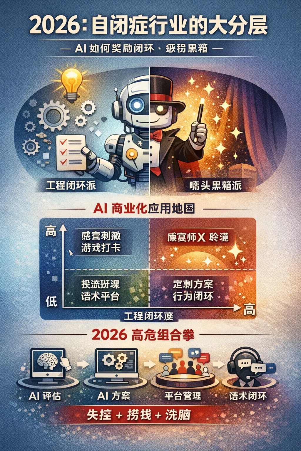 象限四|右下:闭环叙事 × 噱头导向(高危区:新毒瘤的温床)这是我认为 2026 会更明显的一类:伪科学/争议干预方式 + AI 平台化 + 闭环话术。