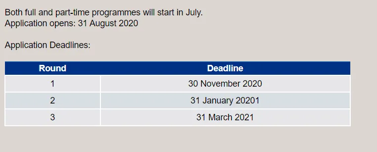 课程第一届原定是开设一个班(50人),但由于申请人数过多,最终变成开设2个班(100+学生),由此也可以看出这个项目竞争的激烈程度了。目前21fall的申请已经开放,第一轮申请在今年11月30日截止,建议大家还是尽量赶在较早的轮次进行申请。(语言要求雅思6.5或托福100,需要GRE/GMAT)
