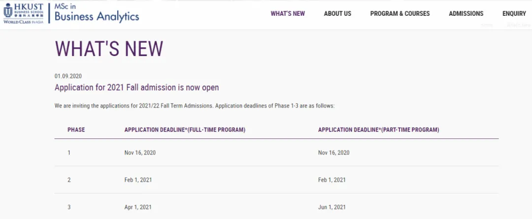 相应的,这个项目录取的学生总体也是以商科背景为主,根据学校官网的数据,77%的学生都来自商业、经济、金融等本科专业。根据往年的申请结果来看,港中文BA项目对申请者的本科学校和G还是比较看重的,建议985/211学校、GMAT700+/ GRE320+的同学申请;对本科GPA倒是比较宽容,一般达到80+即可。21fall的申请目前已经开放,第一轮将在今年10月12日截止,根据往年的录取经验,建议大家在前3轮提交申请。