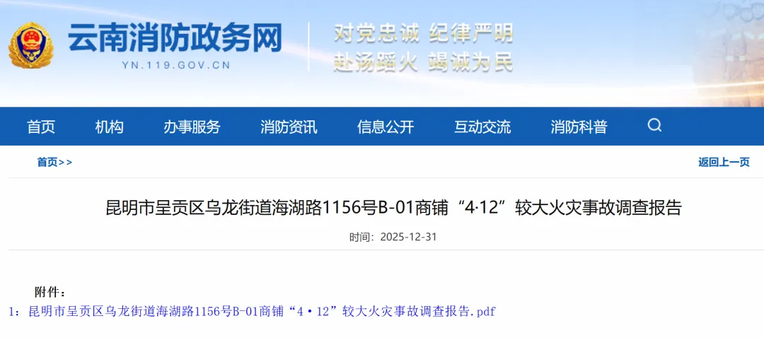 近日,云南消防政务网发布昆明市呈贡区乌龙街道海湖路1156号B-01商铺“4·12”较大火灾事故调查报告。