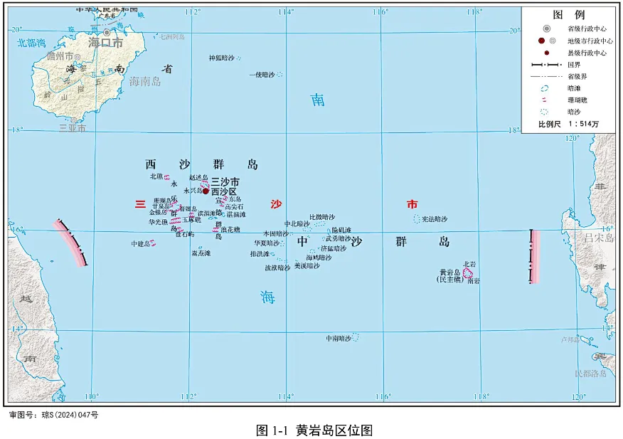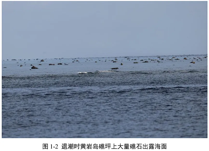 黄岩岛是低潮出露的大型环礁,形态近似等腰三角形(图1-1),南北长约14.5千米,东西宽约13.6千米。湖地形地貌复杂,点礁分布密集,中部水深较深,最深为22.4米,东南端有一个宽约400米的口「门与外海相连,口门水深最深为11.5米。坏礁礁坪有大量礁石在退潮时出露海面(图1-2),北、南两侧各有一礁石在高潮时出露海面,分别为北岩(图1-3)、南岩(图1-4)。