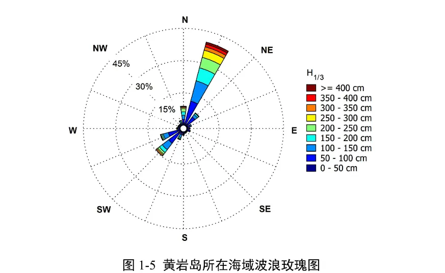 黄岩岛所在海域属热带海洋性季风气候,盛行风向呈季节性变化,10月~次年4月盛行东北风,5月~9月盛行西南风,年平均风速为5.3米/秒;所在海域波浪主要受李风的影响(图1-5),冬李波浪以东北向为主,夏李波浪以西南向为主,年平均有效波高为1.4米;年平均表层海水温度为28.6℃。