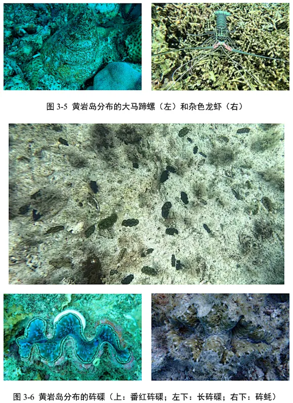 三是珊瑚礁鱼类和大型底栖无脊椎动物种类丰富。黄岩岛发现有珊瑚礁鱼类27科182种(图3-3),隆头鱼科和雀鲷科的种类最多,优势种为栉齿刺尾鱼、双斑光鳃鱼、日本刺尾鱼、钝头锦鱼和金带齿颌鲷。鱼类平均密度为80尾/百平方米,其中东北部鱼类平均密度最高。发现珊瑚礁指示性鱼类鹦嘴鱼16种、蝴蝶鱼17种。分布有蜂巢石斑鱼、斑点九棘鲈、黑尻、隆背笛鲷等多种经济鱼类。大型底栖无脊椎动物种类多,王要类别为海绵、海鞘、软珊瑚和腹足类等,分布有杂色龙虾、巨梅花参、厚壳海菊蛤、蜘蛛螺、大马蹄螺等经济物种(图3-4、图3-5)。碟种类多、分布密度高,调查共发现碎碟2属4种,分别为番红碎碟、长碎碟、蚝、瓷口碎蚝,种类数占我国已记录种类数的50%;平均栖息密度为1.2个/百平方米,以湖点礁上分布密度最高,局部区域达75个/百平方米(图3-6)。
