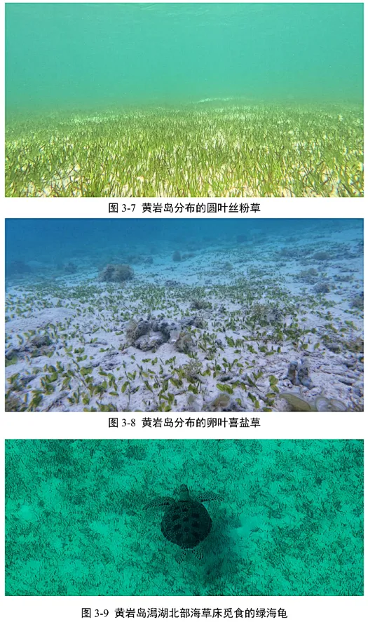 海草床能够净化水体、固碳增汇、稳定海床底质,减少海床砂砾卷起对珊瑚的破坏,为珊瑚礁鱼类育幼和屁护提供场所。黄岩岛冯湖内广泛分布有海草,其甲為湖北部发育有连片繁茂海草,形成面积约1.85平方十米的海草床,平均盖度为19.2%,种类为圆叶丝粉草(图3-7)和卵叶喜盐草(图3-8),以圆叶丝粉草为王。圆叶丝粉草生长茂盛,茎枝平均密度为1118.7株/平万米,平均高度为10.6厘米,碳密度为58.0兆克碳/平方十米。海草床区域发现有绿海龟觅食(图3-9),分布有驼背凤螺、桶形芋螺、白棘三列海胆等多种大型底栖无脊椎动物,其甲驼背凤螺为优势种,平均栖息密度为9.3个/平万米。