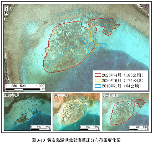 遥感调查结果显示,2010年以来黄岩岛湖北部海草床分布面积持续增加,从2010年的0.64平方千米增加至2025年的1.85平方千米,分布区域从斑块状逐步发展为连片集中分布(图3-10)。