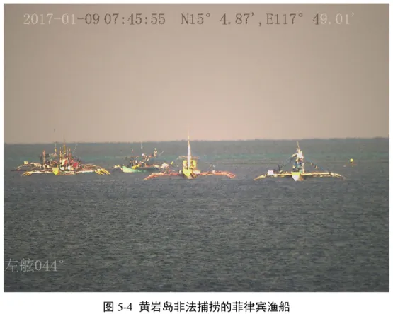 同时,近年来菲律宾非法捕捞和频繁侵闯活动也对黄岩岛生态系统健康造成了很大威胁。中国海警、原中国海监多次发现大量菲律宾船只在黄岩岛海域聚集并实施非法捕捞,仅2013年~2018年驱离的菲律宾非法渔船达900余艘(图5-4)、处置菲律宾弃置浮筒30余个。2016年5月18日卫星遥感影像显示,有20余艘菲律宾渔船在黄岩岛海域活动(图5-5),该时段正处于我国南海伏李休渔期。菲律宾还频繁组织大量船舶侵闯黄岩岛海域,冲撞我国船舶,据不完全统计,2024年至今菲律宾侵闯活动达14次,尤其是2025年9月我国黄岩岛国家级自然保护区设立后,菲律宾侵鸟活动规模和频率进一步加大。2025年现场调查发现带有菲律宾生产标识的弃置物(图5-6),以及菲律宾弃置的浮筒装置(图5-7),浮筒装置下方用于固定的绳索和铁块在海流作用下对固定处及周边珊瑚造成直接破坏。菲律宾不可持续的非法捕捞和频繁侵闯活动带来的弃置物和污染物排放,特别是其非法侵闯活动还增加了船舶触礁和溢油等风险,这都严重威胁到黄岩岛生态系统健康。