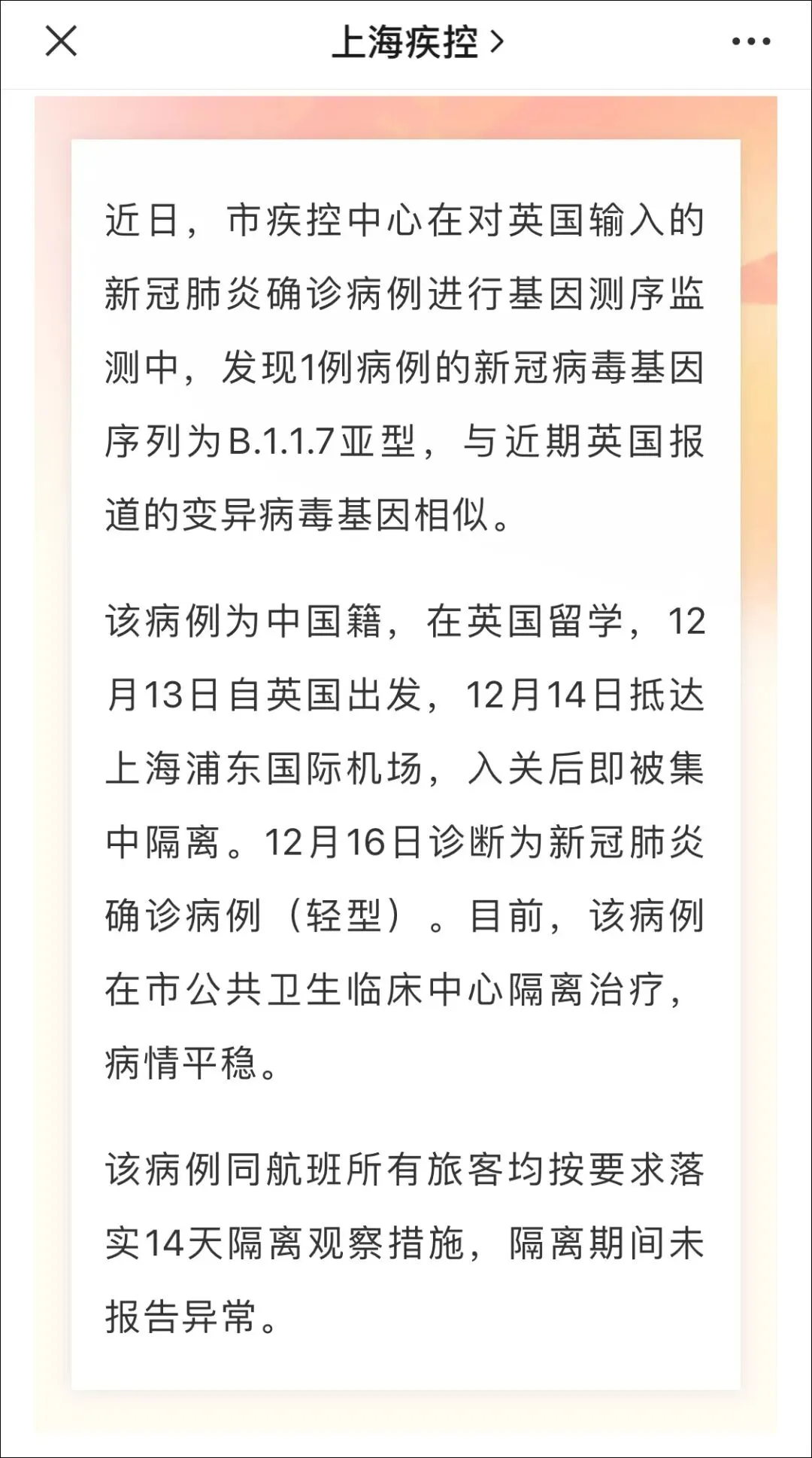 12月30日,中国CDC通报,中国大陆首次报告了最初在英国发现的变异新冠病毒感染病例。
