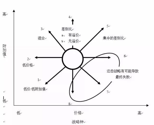 战略钟模型将产品/服务价格和产品/服务附加值综合在一起考虑,企业实际上沿着以下8种途径中的一种来完成企业经营行为。其中一些的路线可能是成功的路线,而另外一些则可能导致企业的失败。
