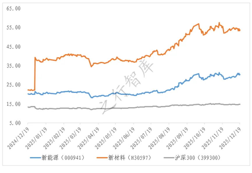 1.估值动态:本期(2025.11.18-12.19,下同)绿色发展领域代表性指数估值走势分化,新材料行业估值回落。根据iFinD数据显示,截至12月19日,绿色发展领域重要代表性指数新能源、新材料行业估值分别为30.32倍、53.66倍,较11月17日分别上涨0.6%、下降4.0%;同期,沪深300指数估值下降0.8%,新材料行业估值弱于沪深300指数估值。