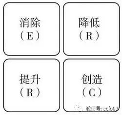 价值创新计划(ERRC) — 在降低生产成本的同时,为提高面向顾客的价值,从消除(Eliminate)、降低(Reduce)、提升(Raise)、创造(Create)4点出发分析