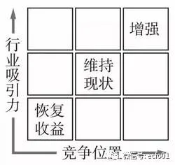 GE矩阵 — 根据长期行业吸引力和竞争力整体(强弱)2项对企业开展的业务进行评估。2项均高时,说明增强;1项低时,说明维持现状;2项均低时,说明需要考虑保持收益的对策。