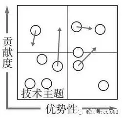 投资组合技术分析 — 纵轴是对企业的贡献度,横轴是占据竞争优势的投资组合,以此对技术主题进行定位。还可用于分析未来的发展趋势。