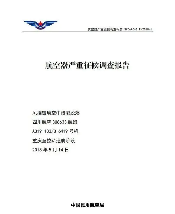 6月2日,中国民用航空安全信息系统发布2018年5月14日川航A319-100/B-6419号机执行3U8633重庆至拉萨航班风挡玻璃空中爆裂脱落事件的调查报告。