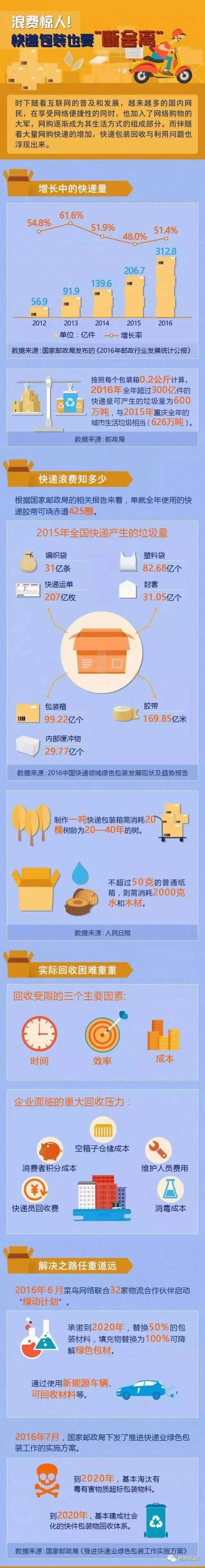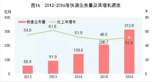 近年来随着网络购物快速发展,快递业呈现爆炸式增长。《2016年邮政行业发展统计公报》显示,快递服务企业2016年业务量达312亿件,连续6年年均增长超50%。