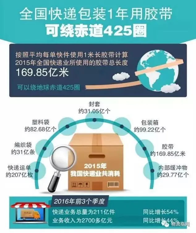 快递行业飞速发展,不可避免地消耗天量的包装材料。国家邮政局此前发布的报告显示,2015年我国快递行业消耗99亿个包装箱、169亿米胶带……同比增长几乎都超过四成。这些包装垃圾可摆满近20万个足球场,胶带总长可绕赤道425圈。
