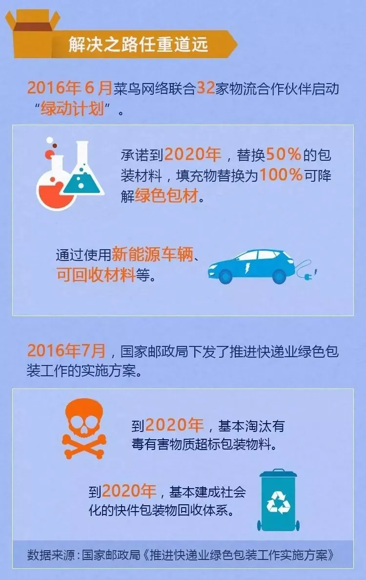 多家快递公司和电商平台已意识到快递垃圾的危害,并已开展行动。2016年6月,物流平台菜鸟网络宣布,联合32家中国及全球合作伙伴启动菜鸟绿色联盟,实施“绿动计划”,承诺到2020年替换50%的包装材料,填充物为100%可降解绿色包材。