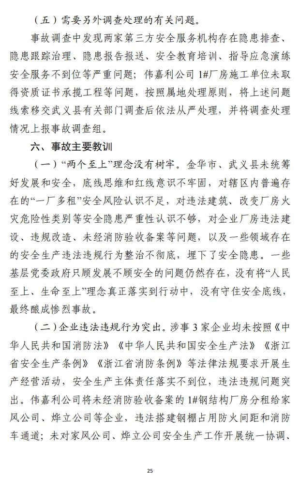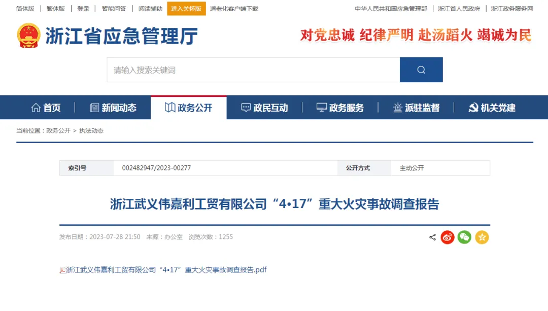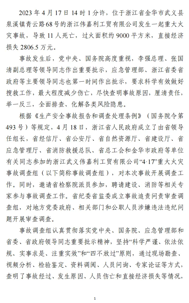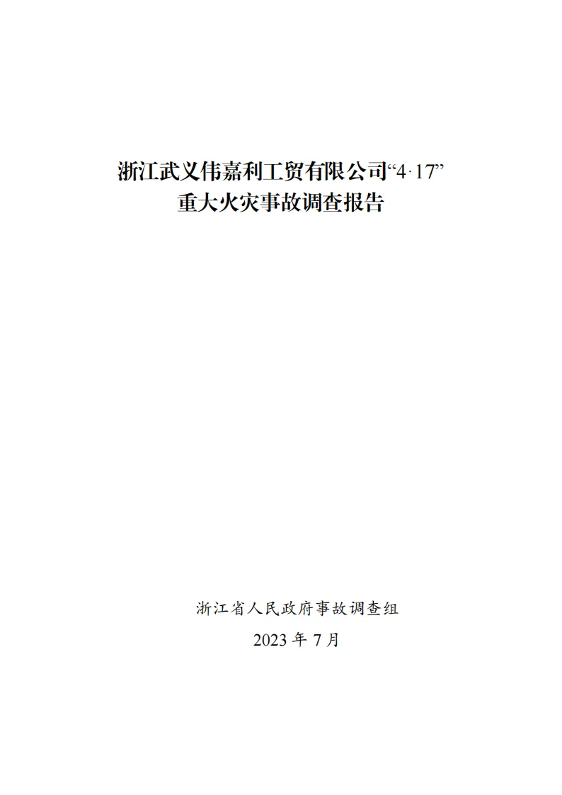 日前,浙江省人民政府事故调查组对外发布浙江武义伟嘉利工贸有限公司“4·17”重大火灾事故调查报告。