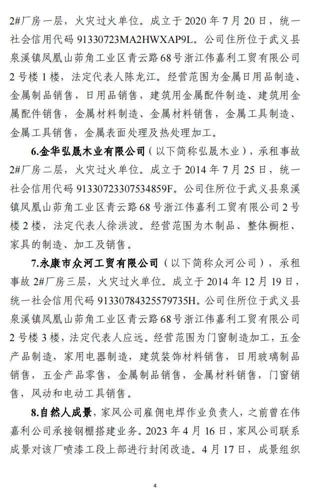 5.成景,家风公司事发时无证电焊作业负责人。2023年4月18日因涉嫌重大责任事故罪被武义县公安局依法刑事拘留。