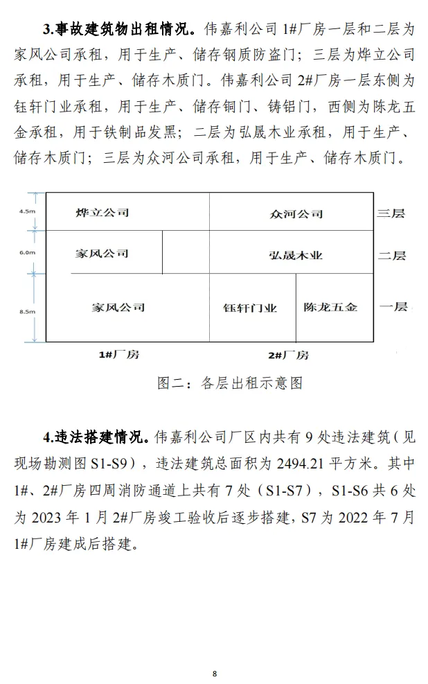 1.伟嘉利公司,违规建设、出租厂房,未履行“一厂多租”企业消防安全管理职责、安全生产统一协调管理职责,对事故发生负有主要责任,建议武义县应急管理局依据《中华人民共和国安全生产法》相关规定依法处理。