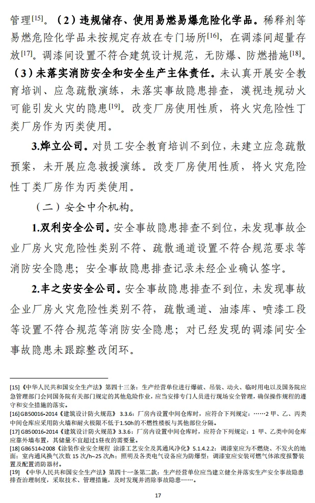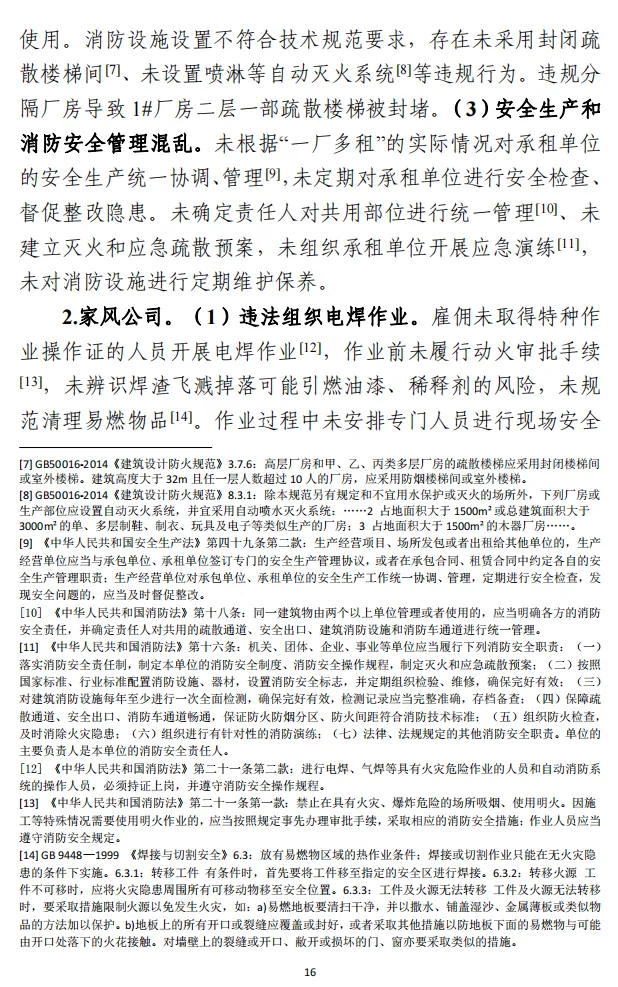 2.家风公司,违规电焊作业,违规储存、使用易燃易爆危险化学品,事故隐患排查不到位,将火灾危险性丁类厂房作为丙类使用,对事故发生负有主要责任,建议武义县应急管理局依据《中华人民共和国安全生产法》相关规定依法处理。
